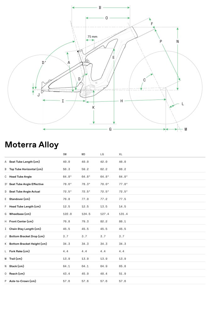 | Rám | Moterra, SmartForm C1 Alloy, 29" wheels, 150mm travel, Proportional Response Tuned Suspension, removable downtube battery, alloy skid plate, 55mm chainline, internal cable routing, 148x12mm thru-axle, UDH, 200mm native post mount brake, 1.5â€? – 1.8â€? tapered headtube, 40mm two-bolt kickstand compatible, integrated Moterra rear rack and fender mounts |